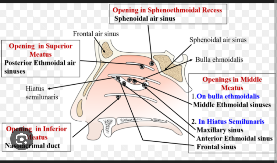 - The **maxillary sinus** drains into the **middle meatus** via the **semilunar hiatus**, an opening located on the lateral wall of the meatus.
