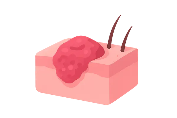 - It often presents as a **red, scaly patch** or nodule with a central ulceration.