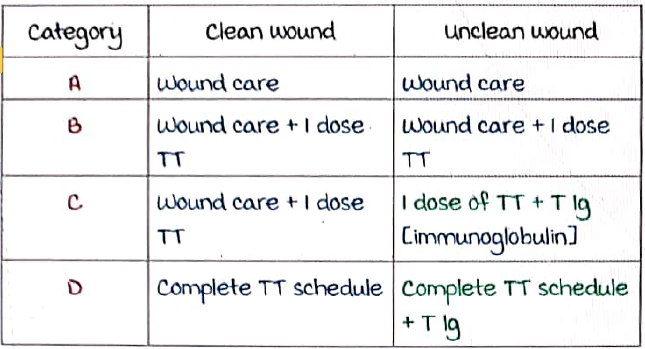 - For a **clean, minor wound** (non-tetanus-prone), if the patient has completed primary immunization and the last TT dose was given **≤10 years ago**, no booster is required.
