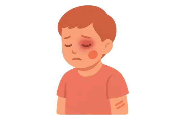 - While child abuse should always be considered in cases of unexplained or excessive bruising, the presence of a **family history of a blood disorder** and the **blue sclera** (suggesting possible osteogenesis imperfecta) make **medical causes** more immediate concerns for initial investigation.