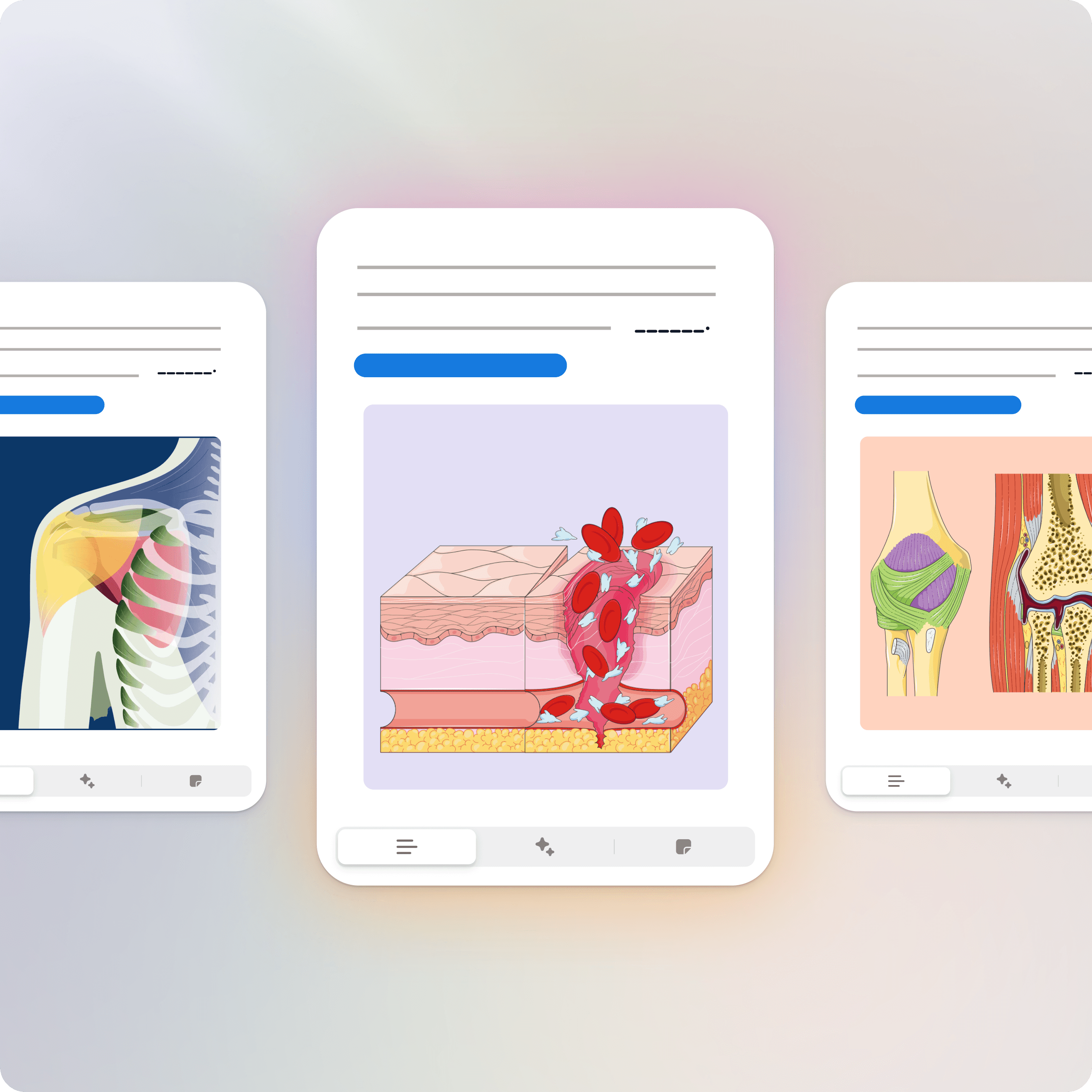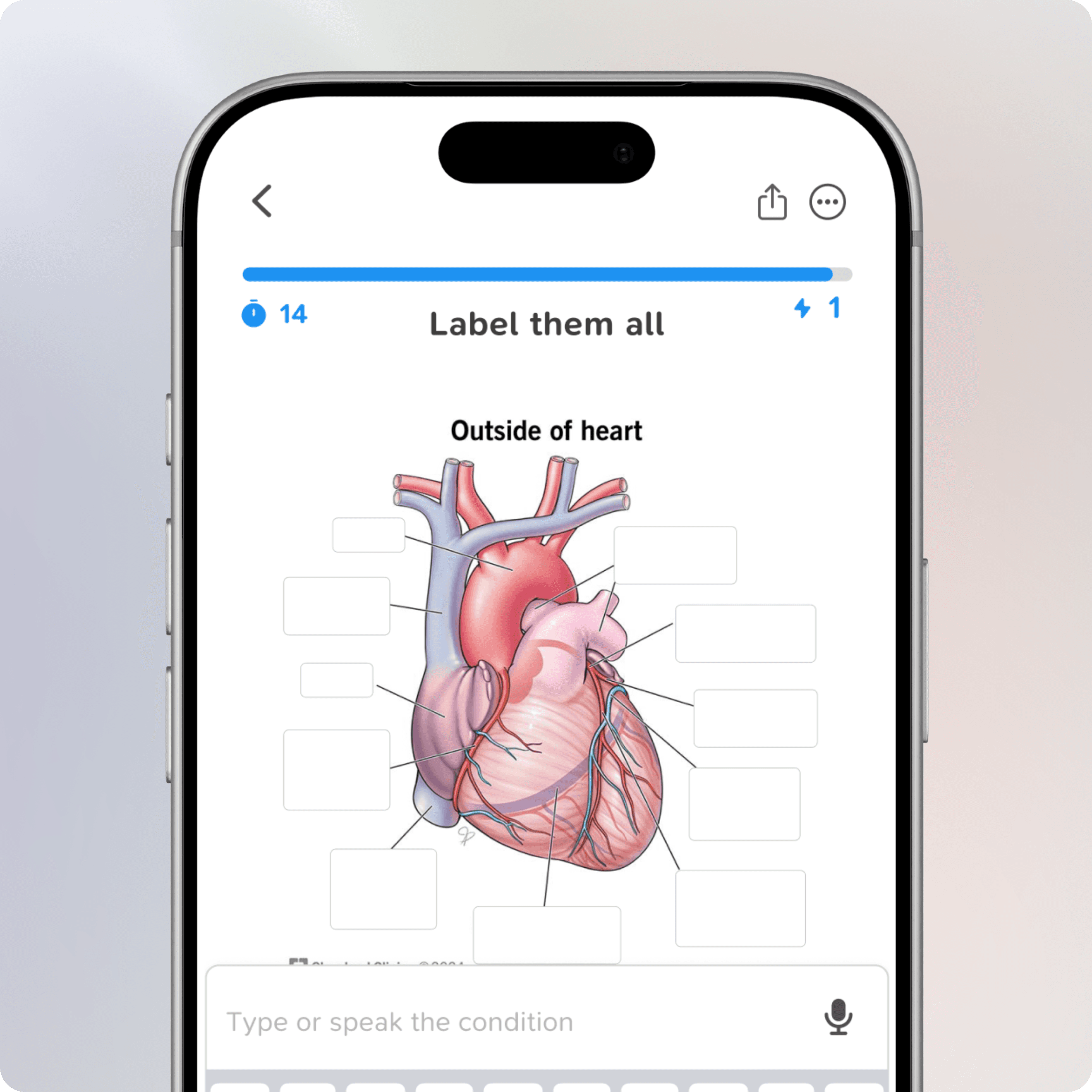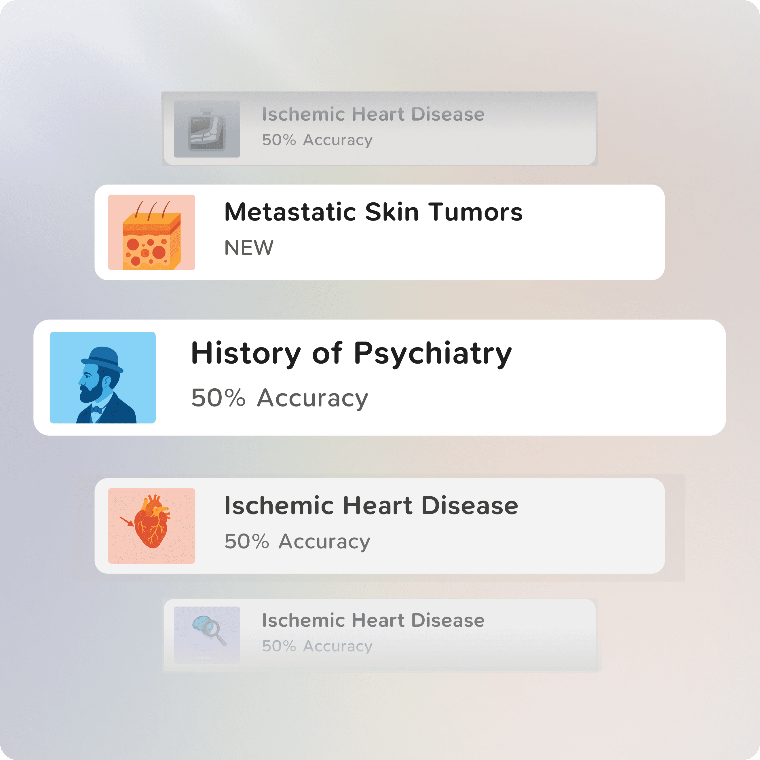 Spaced repetition that adapts to you. Concepts resurface right before you’re about to forget them, helping you lock in high-yield facts with less effort and better long-term retention.