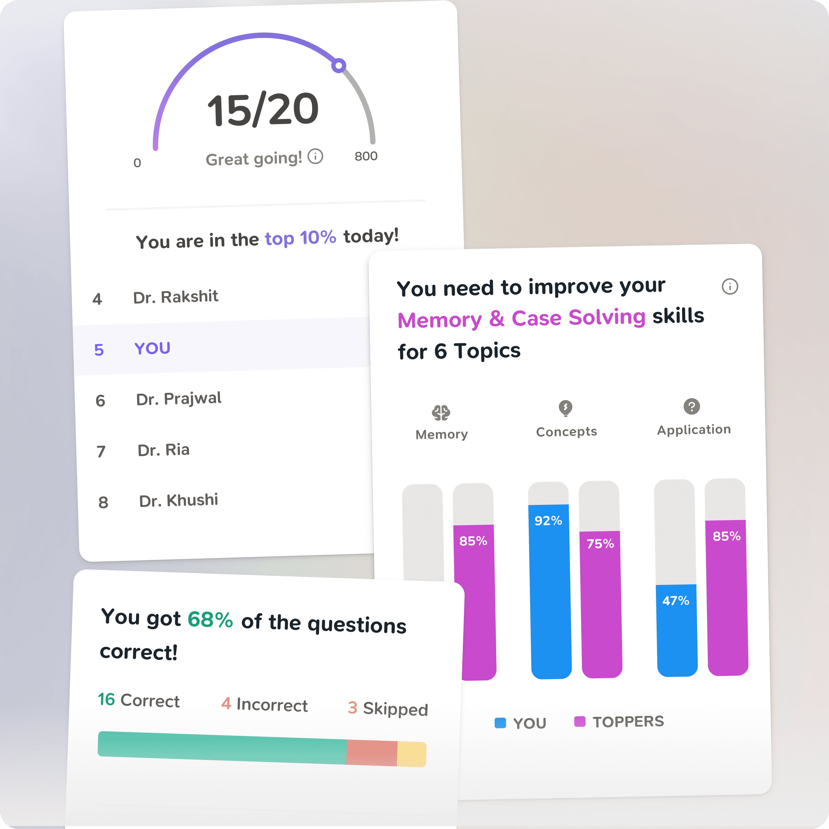An exhaustive MCQ bank across all 19 subjects, backed by detailed and personalized explanations, adaptive custom quizzes, and smart performance analysis.