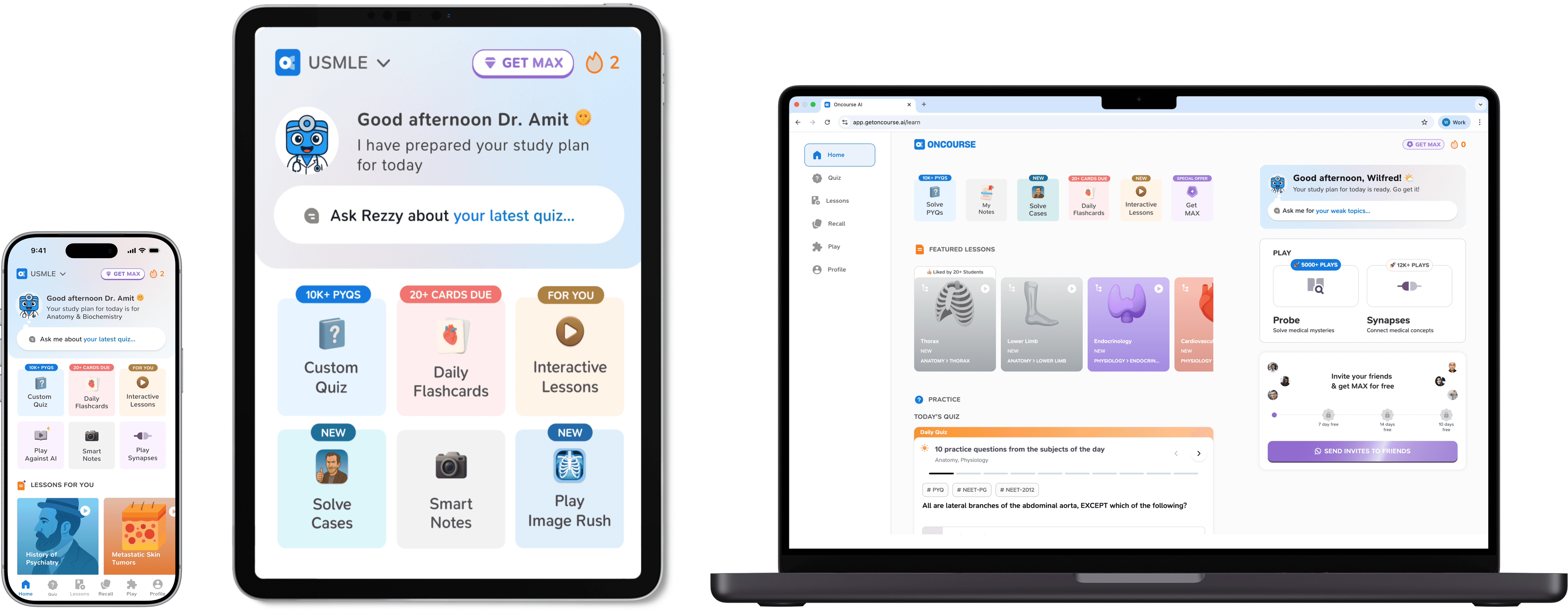 A QBank built to reflect how exams actually test you—60% clinical, 30% application-based, and 10% one-liners. Create smarter custom modules, practice questions that truly matter, and get clear, personalized explanations. Rezzy, your AI study partner, is always ready to break down any question in a way that matches how you learn.