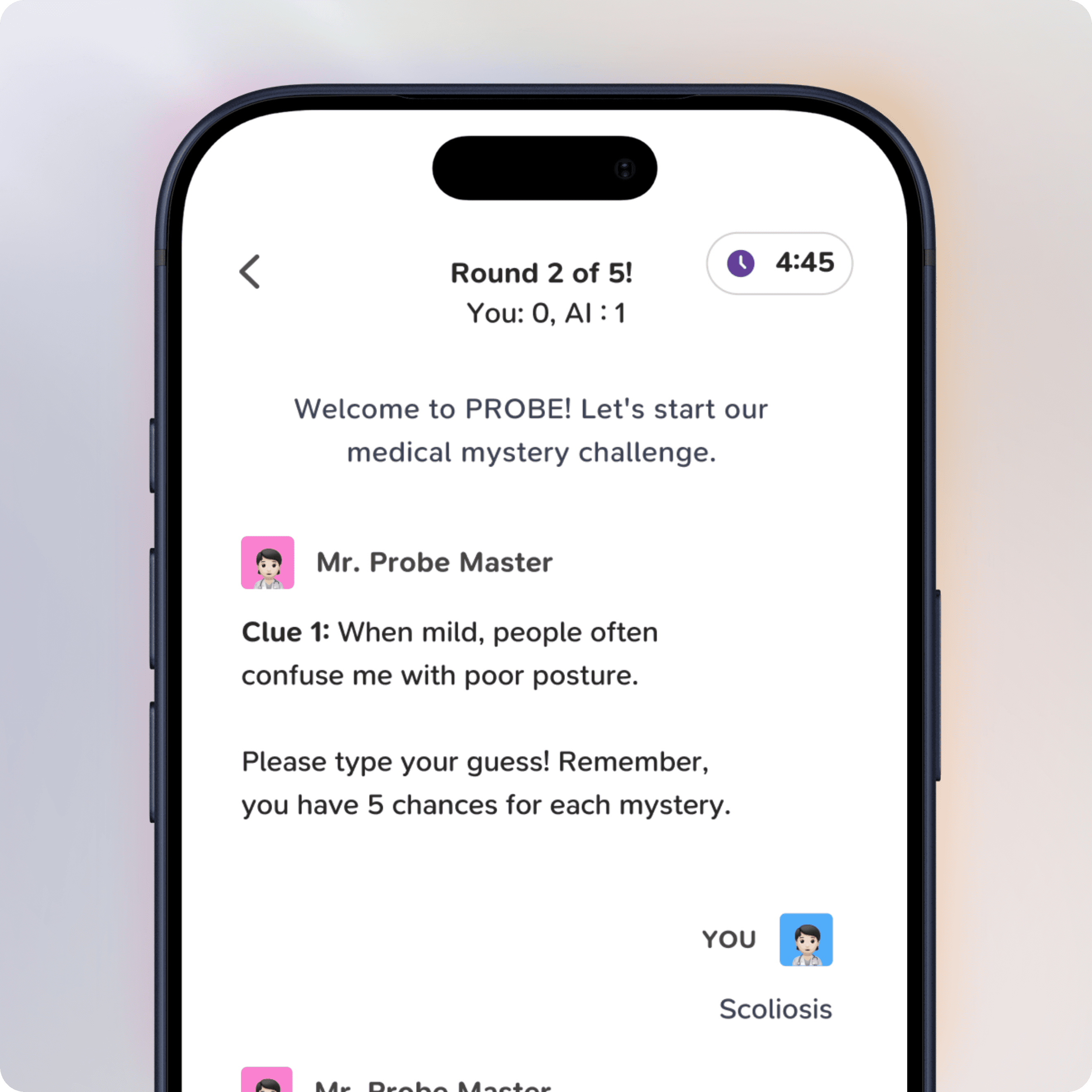 Probe pushes your diagnostic skills through an intriguing, game-driven experience. The AI reveals up to five hints, guess sooner to score more. After each round, you get instant explanations on what you missed and how to fix it. Diagnose faster, choose tests smarter, and score higher on case-based MCQs.