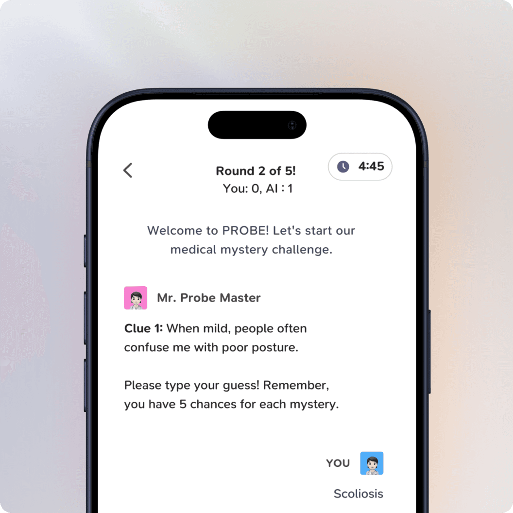 Step 2 gives you a vignette and asks: "What is it?" Probe trains that exact skill. You get clues one at a time—make your diagnosis before you run out.
